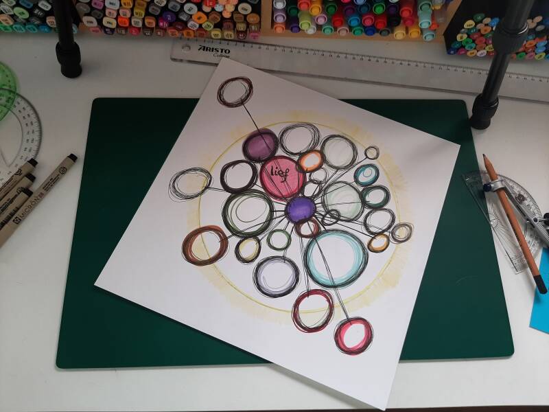 Je kunt kiezen voor een intuïtieve manier van tekenen of voor een bewust plan. Kleuren, figuren en verbindingen creëren zich vanzelf zonder thema. Je Mandala "ontstaat". Je gebruikt hierbij je linker hersenhelft.